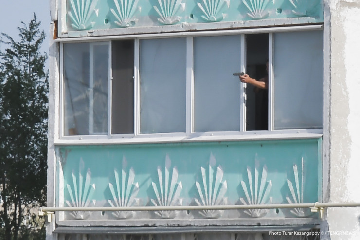 На балконе замечаем человека с пистолетом в руках. Снова слышны хлопки. Люди снизу что-то говорят, чувствуется напряжение, потом вооруженный человек выходит на улицу, спор продолжается.