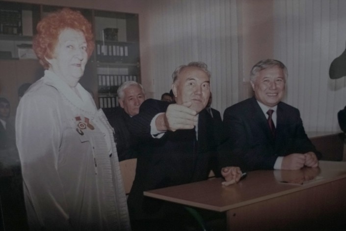 На этом фото фрагмент посещения Назарбаевым родного училища, когда он уже стал Президентом. Слева на снимке - его преподаватель Нина Филипповна. "Ее уже, к сожалению, нет, но когда он приезжал, они всегда так хорошо встречались, разговаривали", - рассказывает Староженко.