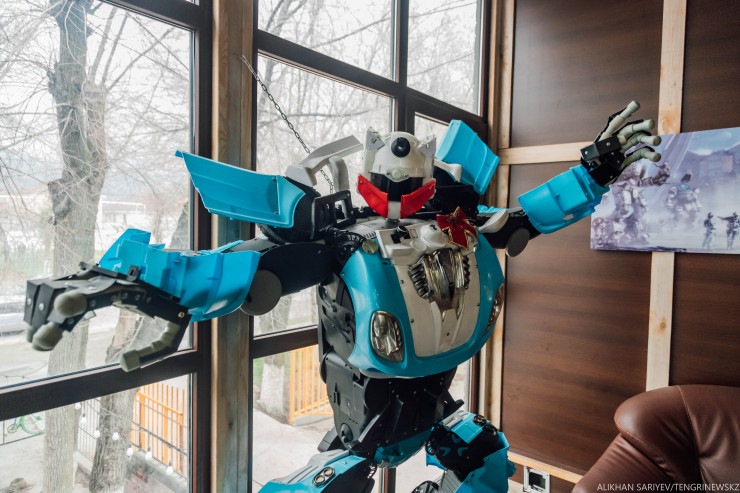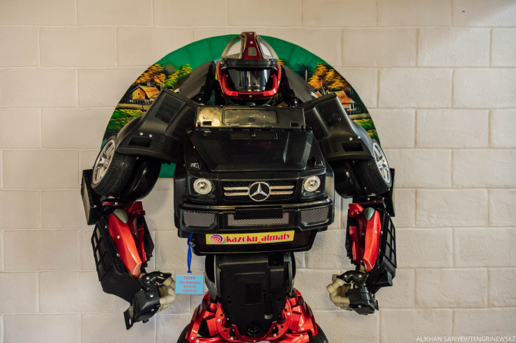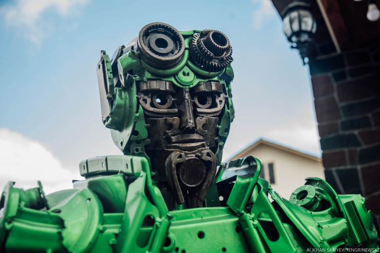 А вот мой самый сложный экспонат, - продолжает свой рассказ Куаныш. - Это Динобот, персонаж вымышленной "Вселенной трансформеров". В одной части фильма он с Оптимусом Праймом дерется, и тот его вербует, а потом они вместе сражаются. Когда я захотел создать динозавра, то начал интересоваться у своих знакомых, кто и как их делает. Мои единомышленники проживают в России, Китае, Америке, и мы часто друг у друга интересуемся, кто что делает. В конечном итоге я подумал, что смогу сделать динозавра, но это будет такой механический робот.