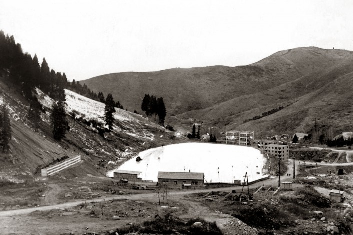 Каток в то время представлял собой залитую площадку с несколькими трибунами. Фото начала 1960-х.