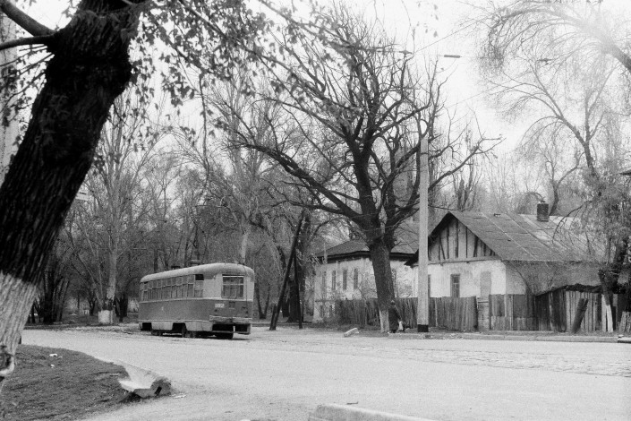 Улица Комсомольская (ныне Толе би), угол улицы Талгарская. Конечная трамвая. 1970-е годы.