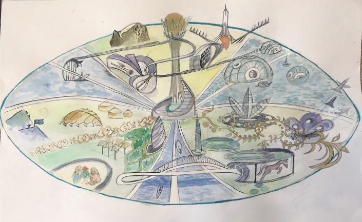 Студентка из Семея Полина Горяева видит будущий Казахстан технологически развитым и при этом сохранившим первозданную природу. Ее работа называется "На крыльях будущего". У каждого жителя страны - собственные крылья, с помощью которых они могут летать. А если посреди полета появилось желание отдохнуть - в их распоряжении парящие в воздухе зеленые островки, на которые можно опуститься для отдыха. С них открывается вид на огромный цветущий город будущего.