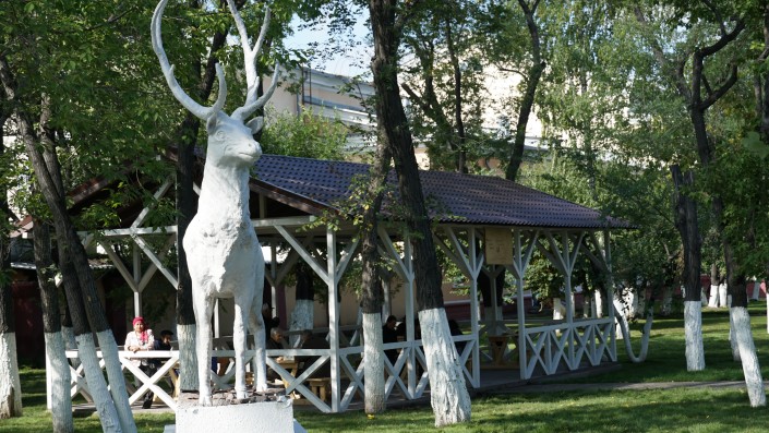 Недалеко находится помещение шахматного клуба, перед ним стоит фигура оленя, который тоже вернулся из той эпохи.