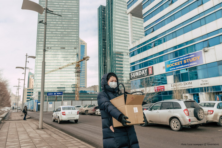 К примеру, вот эту девушку с коробкой наш фотограф встретил на одной из улиц Нур-Султана. Утром 16 марта ее и ее коллег отправили домой... работать.