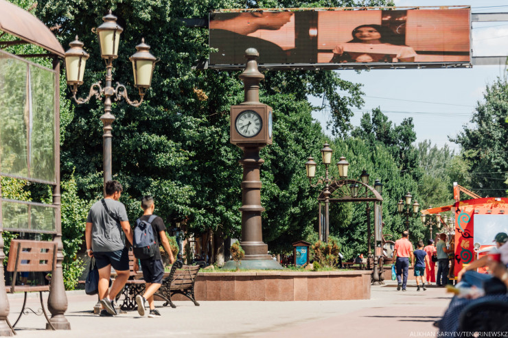 Дальше мы выходим на местный Арбат, это улица имени Биржан-сала. Движение автомобилей здесь перекрыто.