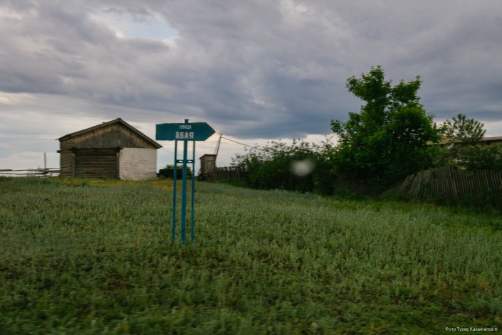 Первое, на что обращаем внимание при въезде в село, - надпись "Добро пожаловать" на казахском - "Қош келдіңіздер", а также указатель "Улица Абая".