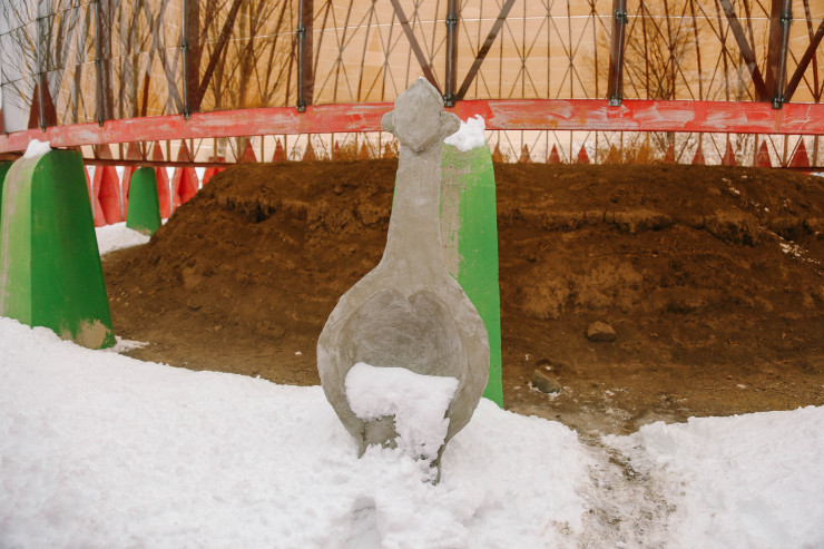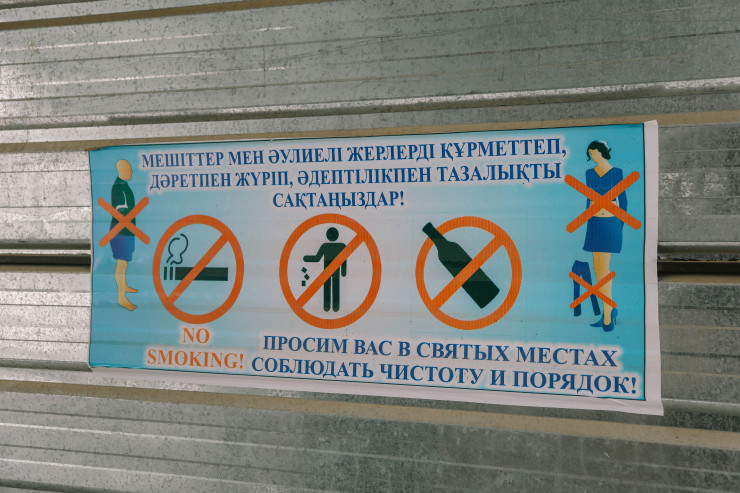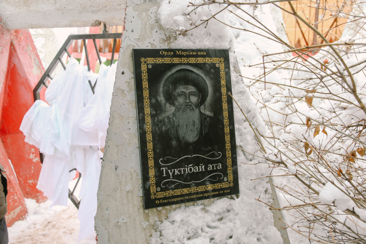 Когда мы приехали, то застали интересную картину: группа людей разного пола и возраста стояла скучковавшись у мавзолея на поляне. Они по очереди перекатывались по снегу, а подгоняла их бабушка с камчой. При этом она энергично приговаривала то на казахском, то на русском: "Ал, давай-давай, жаксылап исте! Катись, катись!" Стало понятно, что это некий обряд, возможно, целебный. Только вот никто из участников не захотел рассказать о том, чем они занимаются. А нашего фотографа убедительно попросили не снимать происходящее.