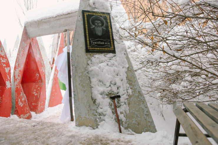 Перед входом в гробницу установлен символ того, чем лечил людей этот сакральный человек, - скульптура того самого кобыза.