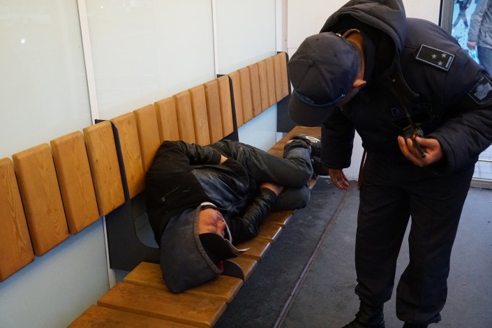 На город спускаются сумерки. По рации снова поступает сигнал, патрульные сообщают, что на теплой остановке близ железнодорожного вокзала лежит мужчина без сознания.