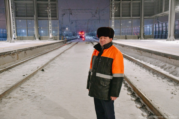 Машинист локомотива Мурат Кажибаев работает на железной дороге 16 лет. По его признанию, пять новогодних ночей он провел в рейсе.
