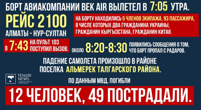 "27 декабря 2019 года в 07:22 рейс № Z2100 авиакомпании Bek Air по направлению Алматы - Нур-Султан при взлете потерял высоту и пробил бетонное ограждение. Произошло столкновение с двухэтажным строением. Незамедлительно начались спасательные работы, возгорания не произошло", - сообщают в министерстве.