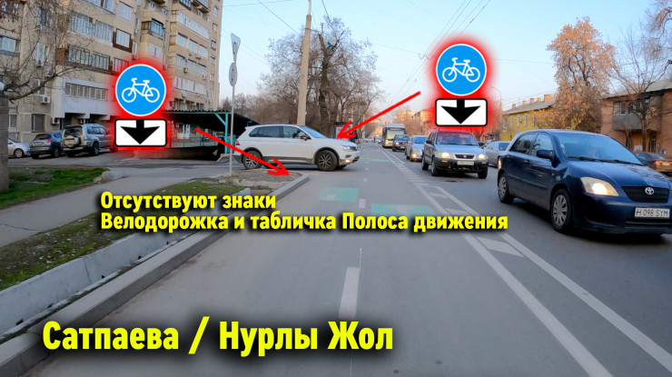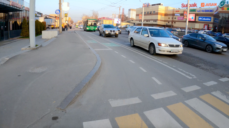 Необходимо или закрасить эту крайнюю правую полосу красной краской, или сделать кусочек велополосы из нее, который будет после Манаса продолжаться.