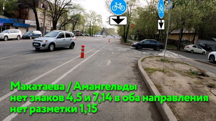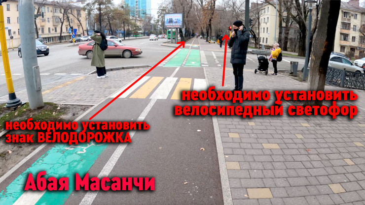 "Перед Манаса нужно убрать крайнюю правую полосу, которая появляется за 30 метров до перекрестка. До перекрестка три полосы прямо. После перекрестка - две полосы прямо. Из-за этой третьей полосы автомобили выезжают прямиком на велополосу и едут по ней, образуя пробку на перекрестке.