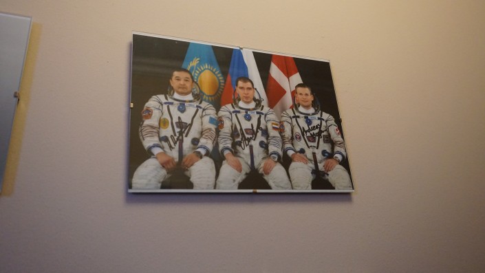 Здесь же висит и фотография казахстанца Айдына Аимбетова, он вместе с другими членами экипажа прибыл сюда после полета в космос в 2015 году.