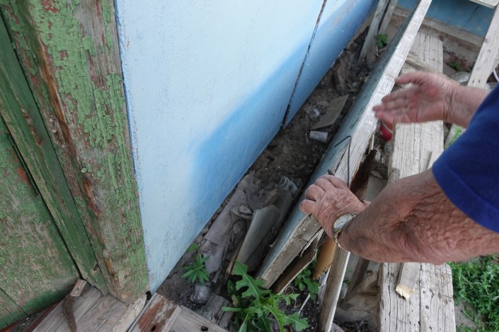 За годы ожидания сноса ее дом просел. Приходится постоянно делать ремонт, временами откачивать воду.