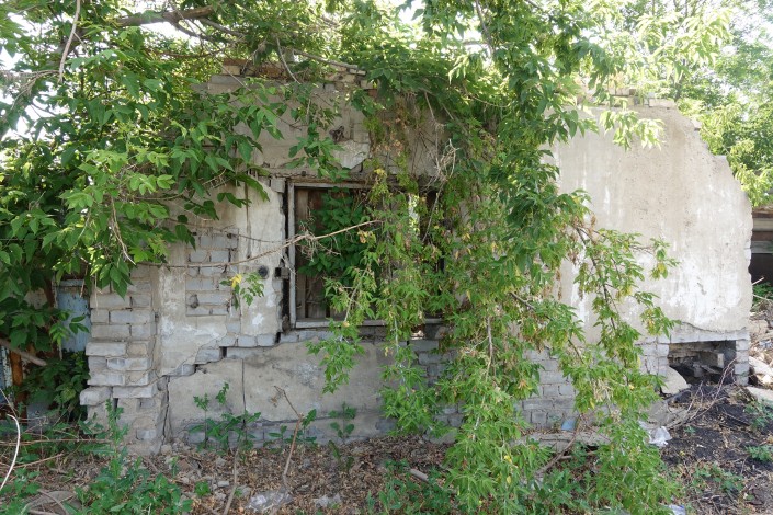 Эти развалины соседствуют с цветущими полисадниками домов, до которых снос еще пока не дошел.
