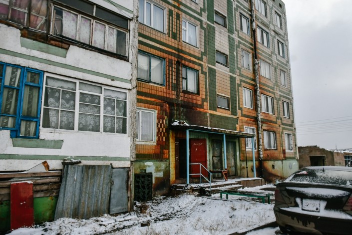 Даже издалека на единственной пятиэтажке в Автоматике можно разглядеть желтые и коричневые пятна. Это последствия отключения дома от центрального отопления.