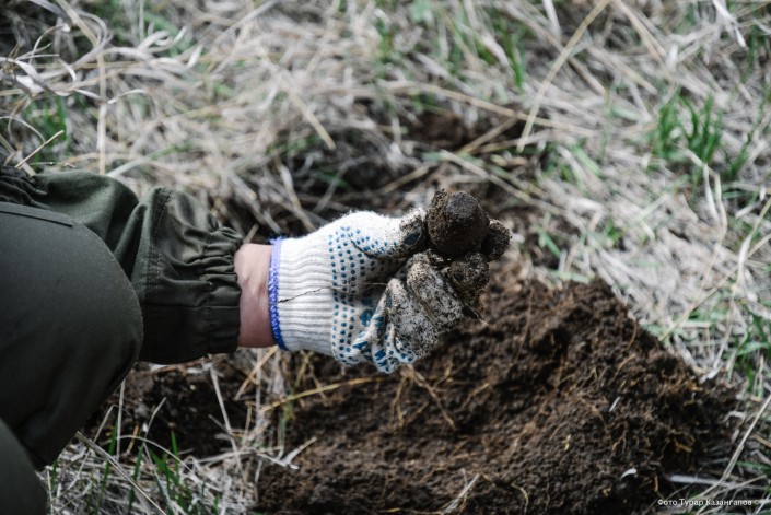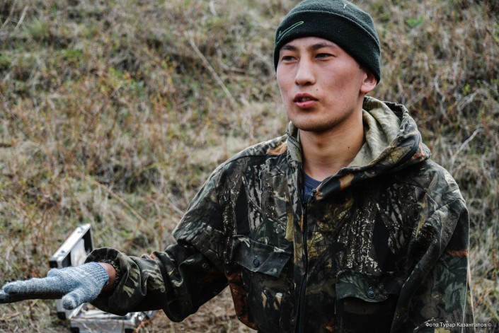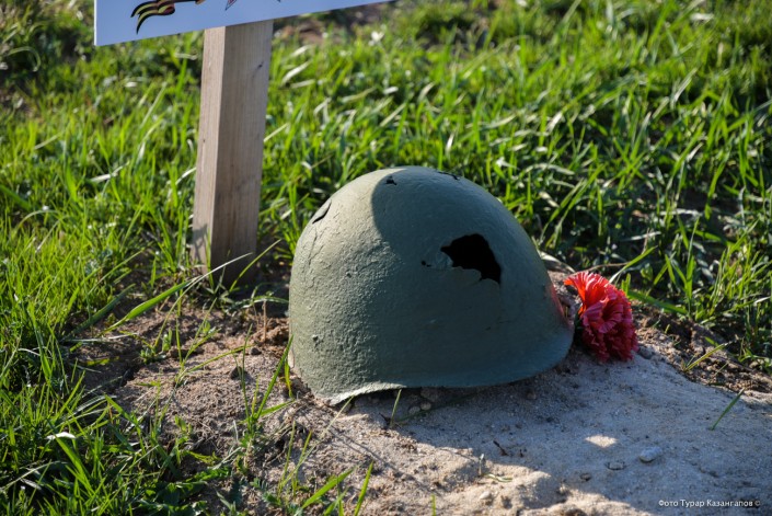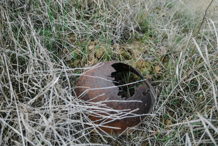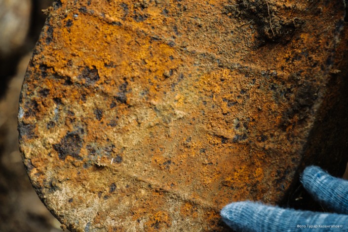 "Прошлись металлоискателем - вроде что-то зазвенело, копнули чуть - нашли краешек каски", - рассказывает молодой поисковик Руслан Нурпеисов.
