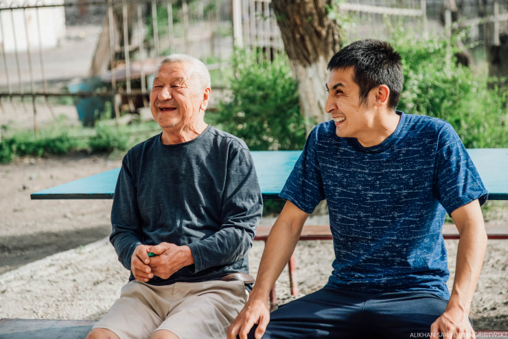 Мы завершали нашу поездку и напоследок поговорили с двумя очаровательными мужчинами из разных поколений — Кахарманом и Шухратом. Кахарман, бывший учитель русского языка, и Шухрат, молодой незрячий парень, который мечтает о работе. Шухрат нам рассказал, что раньше в Шелеке было "Казахское общество слепых", при нем было свое производство - ребята вязали веники, зарабатывали, а еще общались и находили верных друзей. Сейчас его нет.