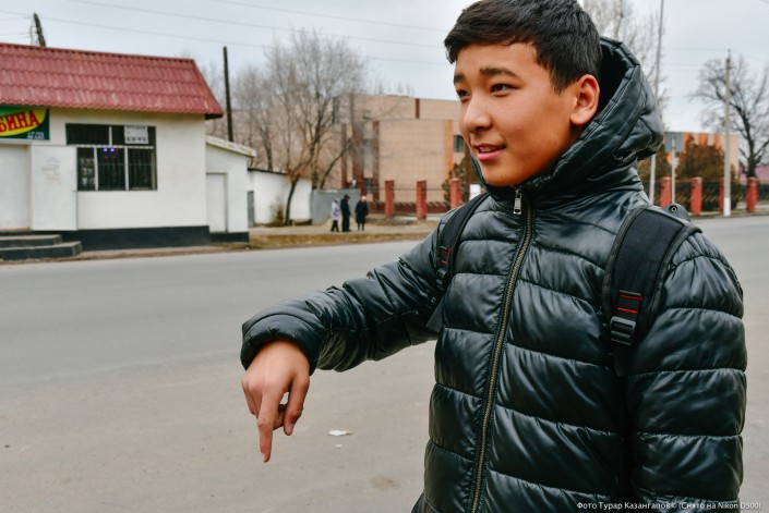 Еще один из ребят демонстрирует третий жест, вращая палец вокруг. Это означает "по территории поселка".