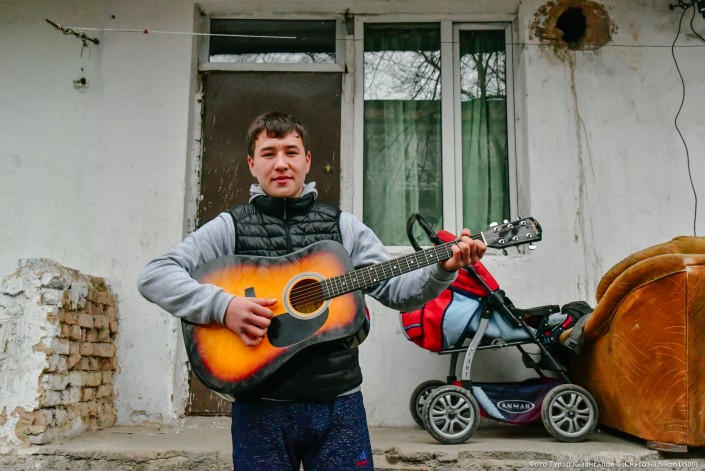 Это местный житель Самат. Он любит громко, во весь голос петь песни под гитару.