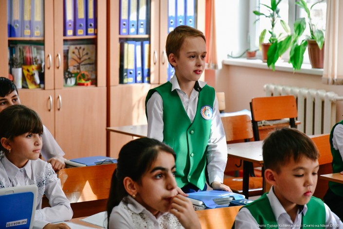 В другом классе дети постарше смотрят ролик про Президента, а потом читают стихи. По всей видимости, для них разговоры о Главе государства - привычное дело.