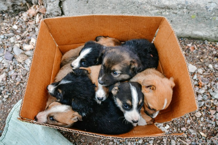 "Вот, собака родила. Кому-то теперь раздать надо их", - говорит один из них.