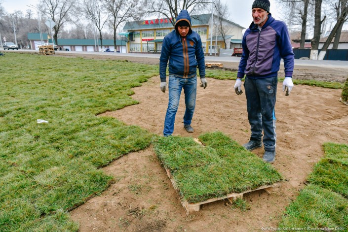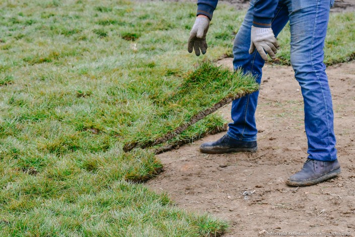 Разрезанную на квадраты траву они ловко укладывают на подготовленную почву.