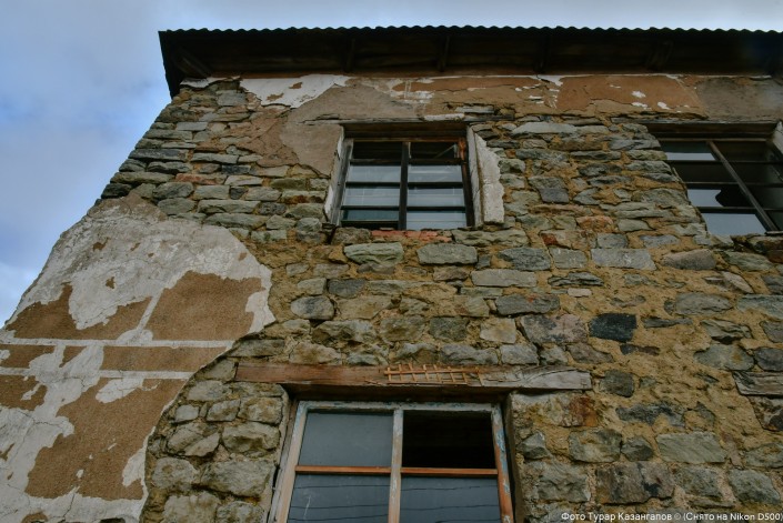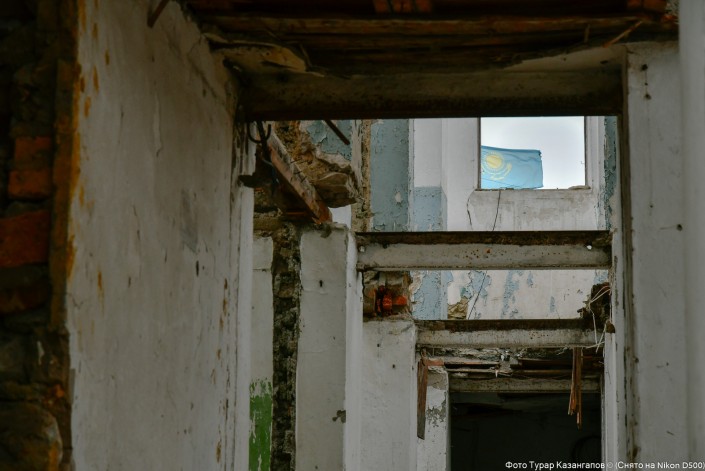 Фото сверху можно назвать "Взгляд из прошлого в настоящее". Из окна заброшенного здания виднеется флаг независимого Казахстана.