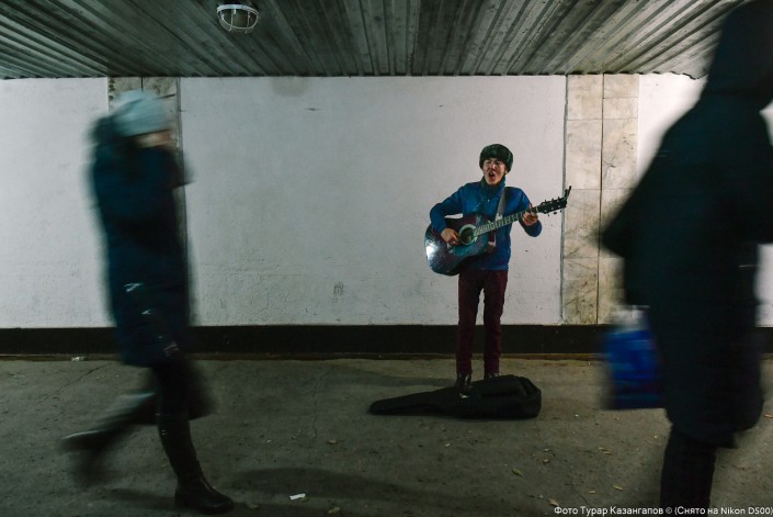 Это Секен Дюсенбеков. В одном из подземных переходов Караганды он поет под гитару песню о любви к родине. В Караганде он уже десять лет, за это время кем только не работал, но в итоге понял, что без музыки жить не может.