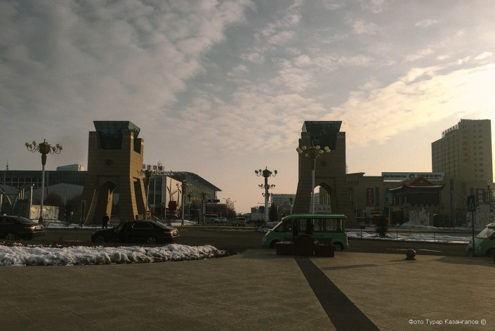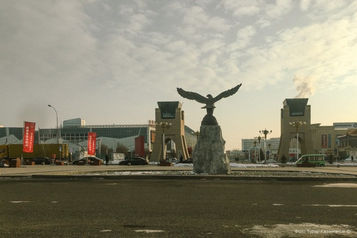 На казахстанской стороне есть центральная площадь. Она называется "Самрук". Здесь же находится монумент с птицей.
