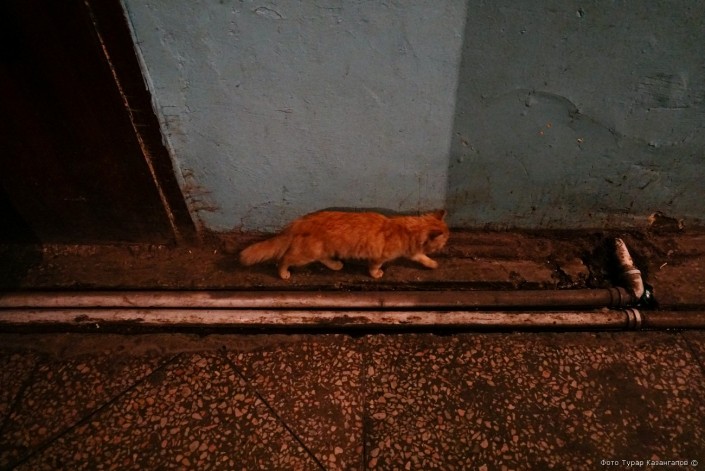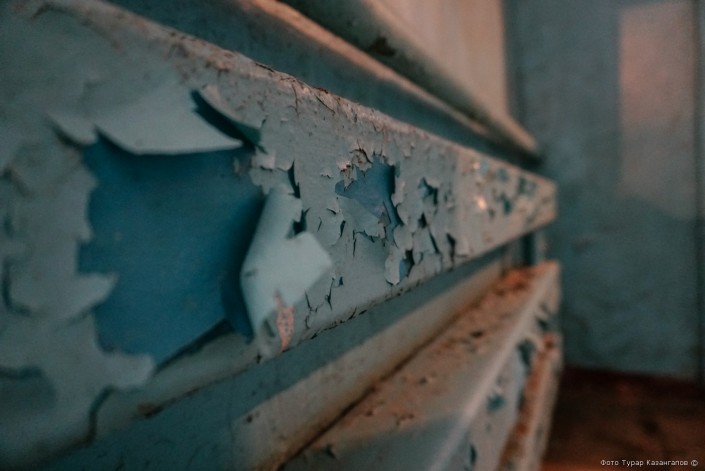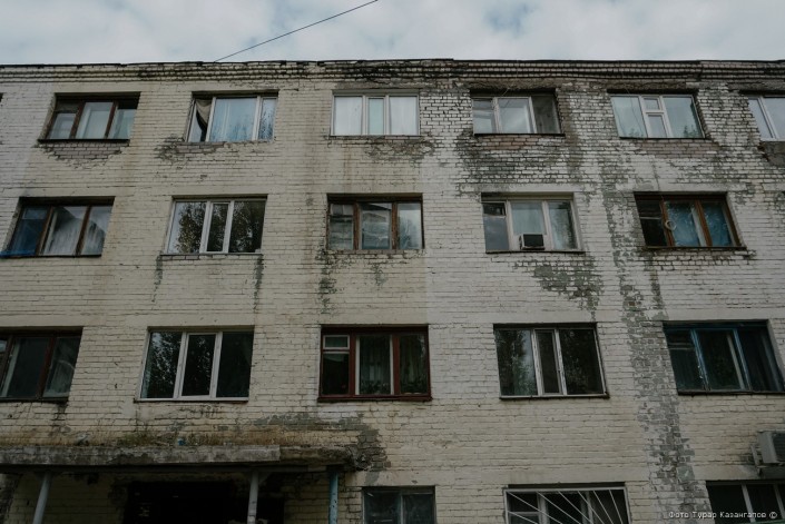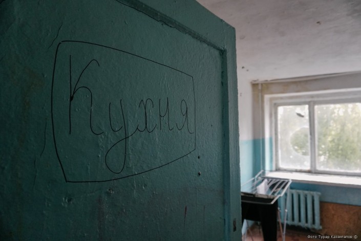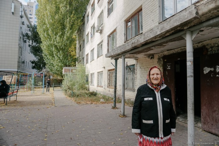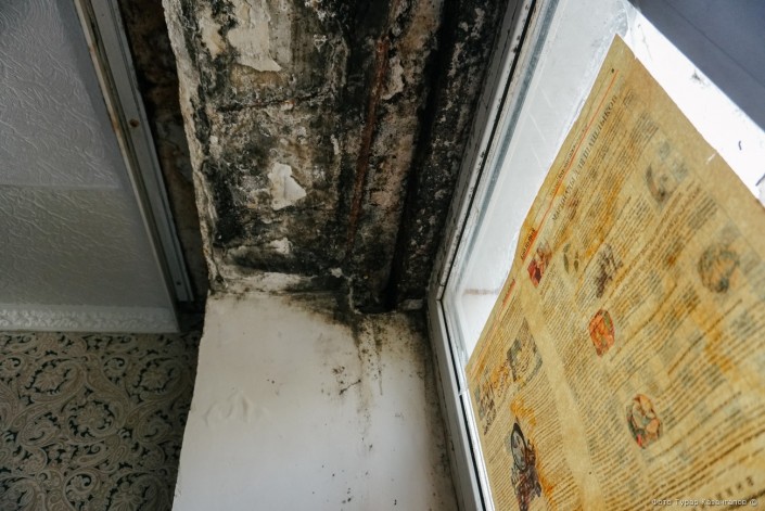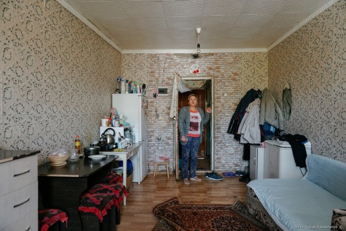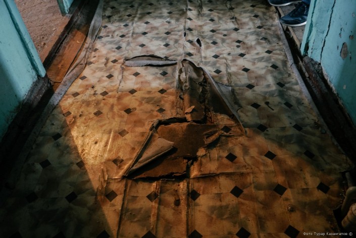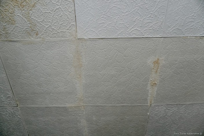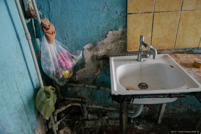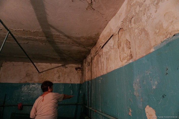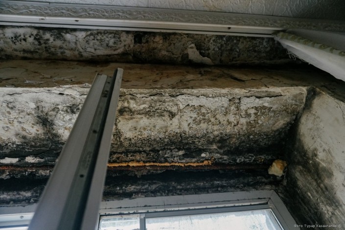 "Вот здесь крыша течет. Я еще не успела покрыть крышу в этом году, и вот до шифоньера у меня стенка обваливается. Каждый год крышу приходится крыть, потому что в бетоне уже есть ручейки, мы-то крыши свои кроем, а вода внутрь все равно продолжает течь", - рассказывает Рита Габдулхакова. Она живет здесь уже с 1991 года.