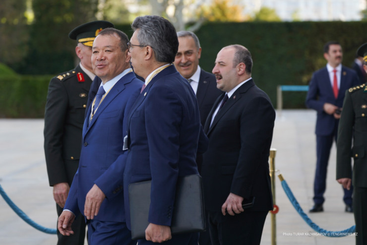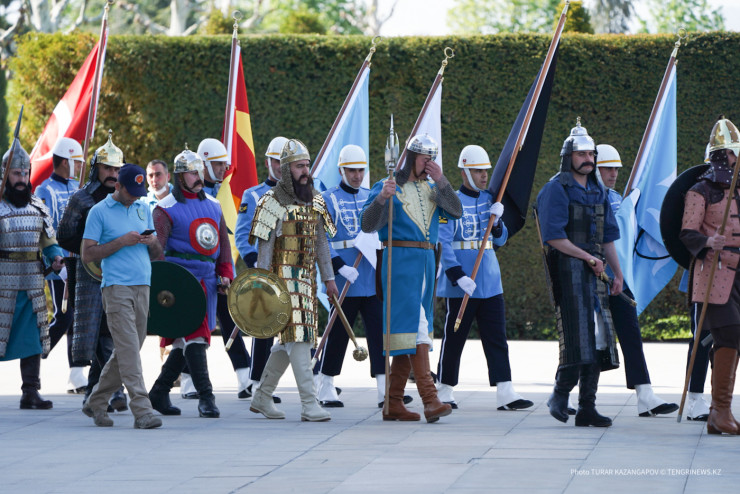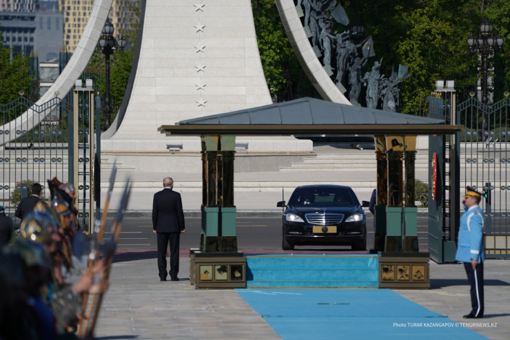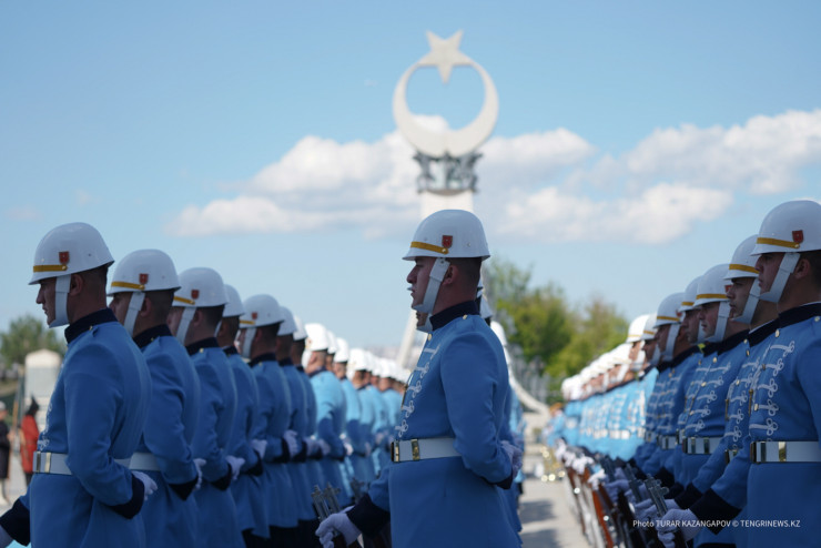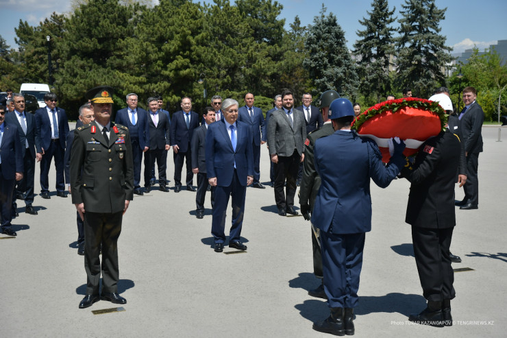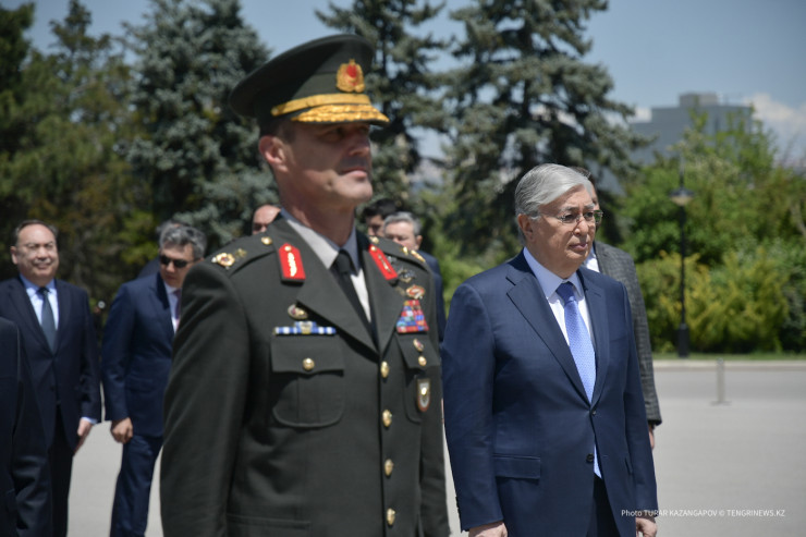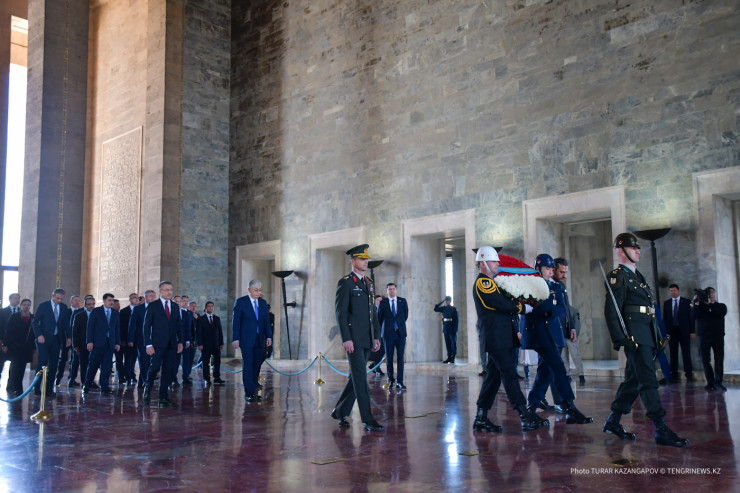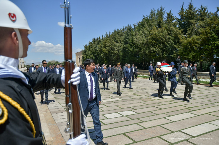 Токаев прошел в мавзолей в окружении военных Турции и Казахстана.
