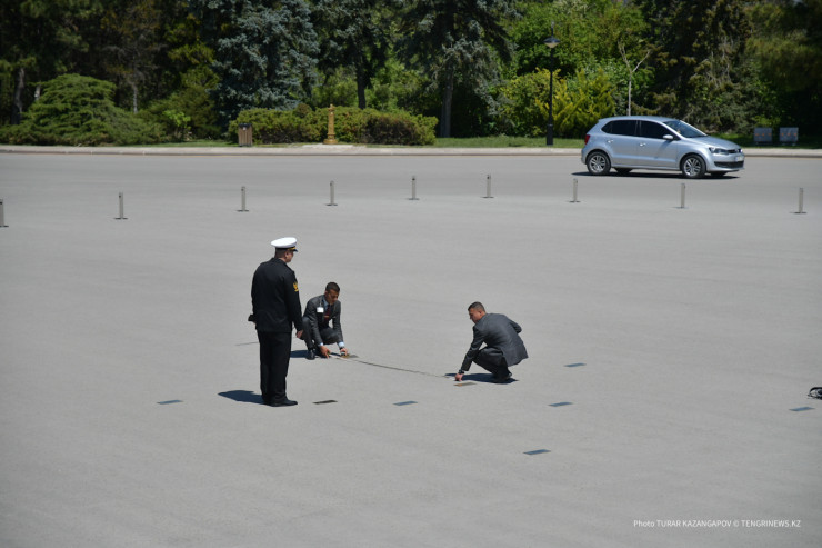 План мероприятий был рассчитан буквально до миллиметра. На кадре видно, как сотрудники отмеряют расстояние между метками, куда должны встать участники официальной церемонии.
