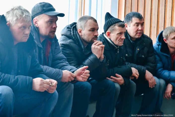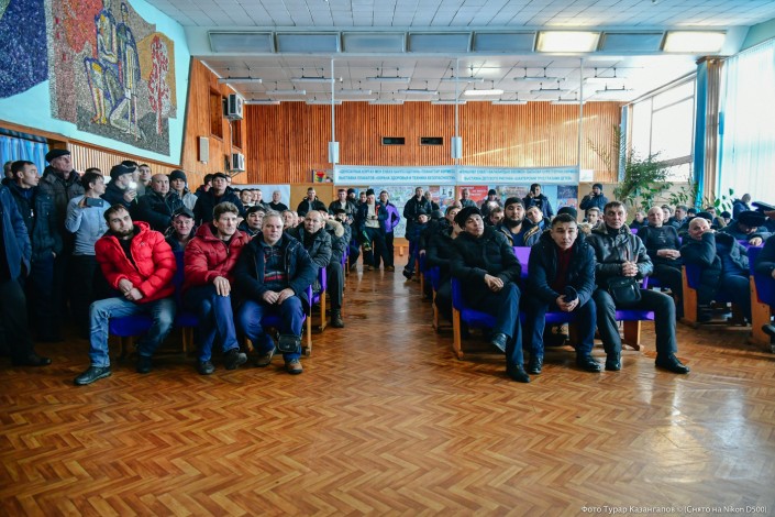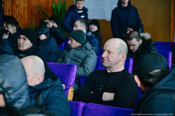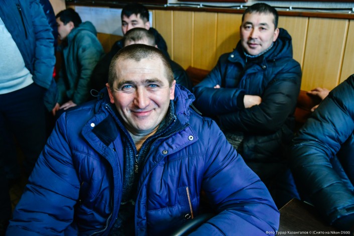 Между тем в актовом зале становится больше людей. На встречу с шахтерами приехал председатель профсоюза "Коргау" Марат Миргоязов.