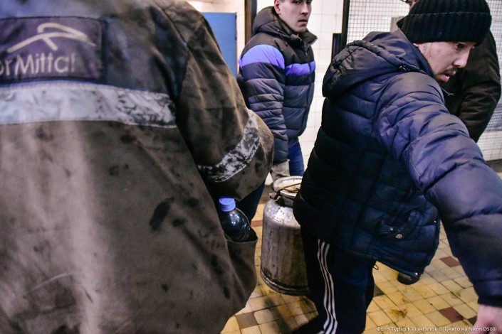 "Мы здесь все дни находимся. Смену свою отработаем и остаемся. Поддерживаем своих, тех, кто внизу. Сами видите, никаких провокаций нет у нас, все спокойно. Еду покупаем, теплую одежду, обувь и отправляем вниз. Знаете, там на глубине 477 метров не столько еда нужна, а тепло, так как там сыро очень и холодно", - рассказал нам Дархан.