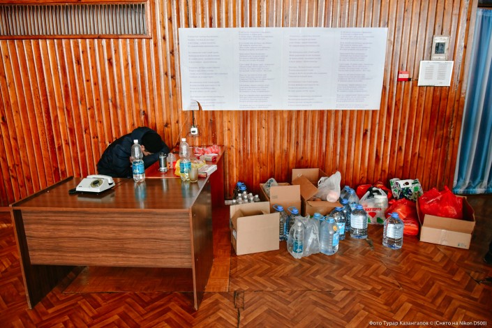 Шахтеры окружают нас и за считанные минуты мы оказываемся в самом здании. Первого, кого мы увидели в актовом зале - уставшего шахтера, дежурившего возле стационарного телефона. Уже потом нам станет ясно, что этот советский аппарат - самая ценная вещь в эти дни. Но об этом немного позже.