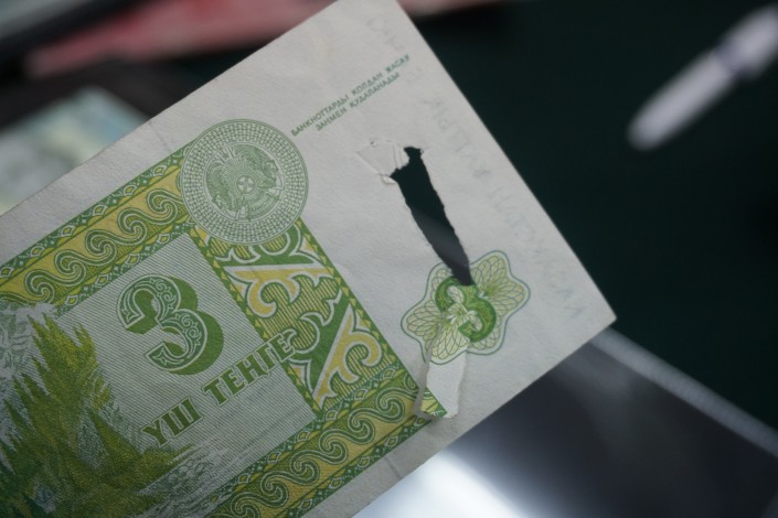 "Вот "высочайшее" качество полиграфии английской банкнотой фабрики Harrison & Sons. Вот, как видите, там наверняка торопились сделать заказ и получить деньги от Казахстана - результат налицо", - говорит коллекционер, демонстрируя обрезанную по верхнему краю банкноту.