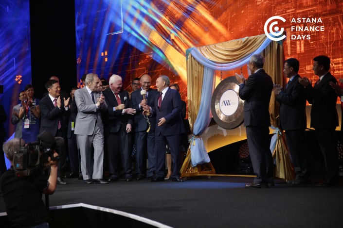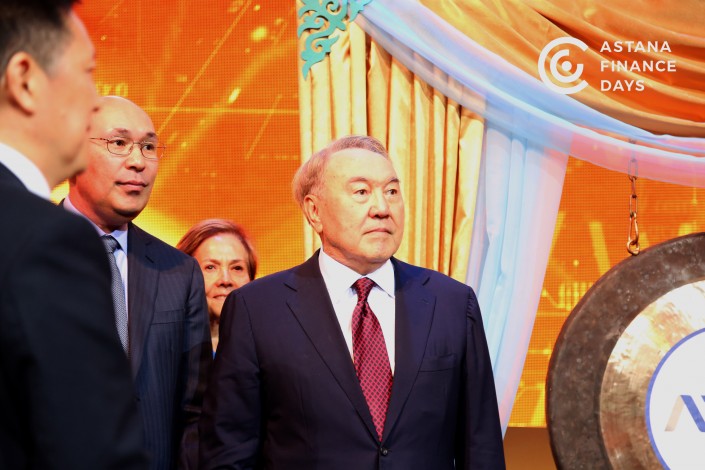 Кульминацией церемонии стал символический удар Главы государства в гонг с логотипом Биржи МФЦА (Astana International Exchange, AIX).