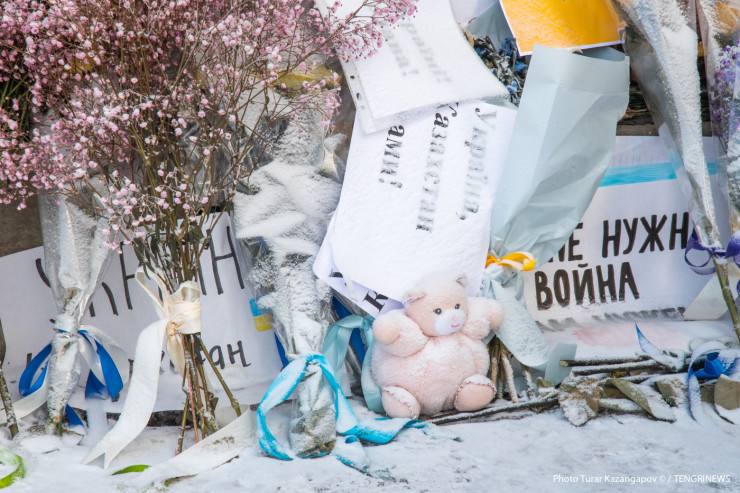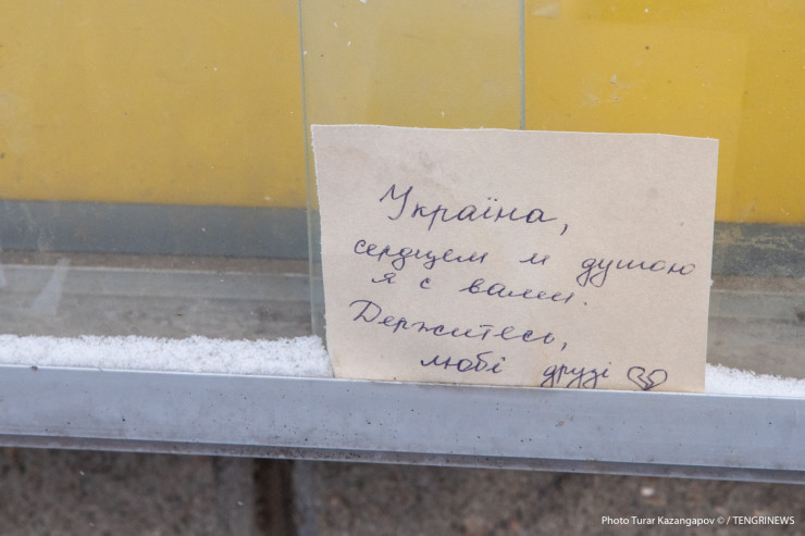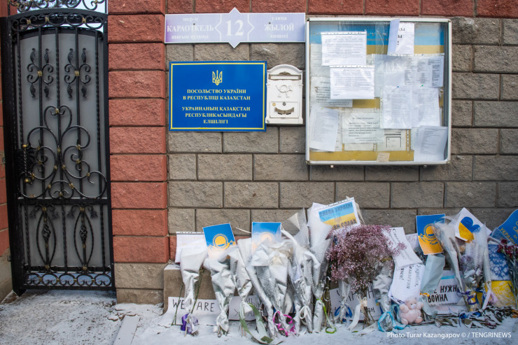 "Украинцы, как и русские, все наши братья, мы не делим никого". Казахстанцы несут помощь к посольству Украины