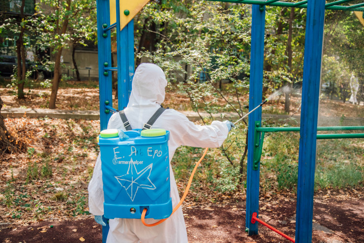 Балалардың ойын алаңы, орындықтың бәрі дезинфекциядан өтеді. Кейін келесі үйге ауысады.