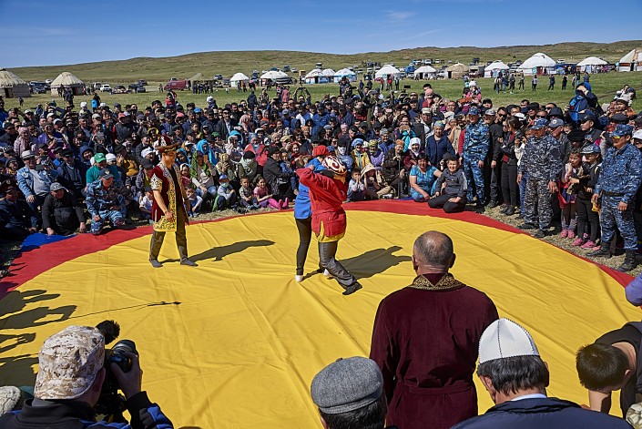 Особый восторг вызвало состязание женщин -"Қатын күрес". Настоящие казахские джигиты померялись силой в "Аударыспак".