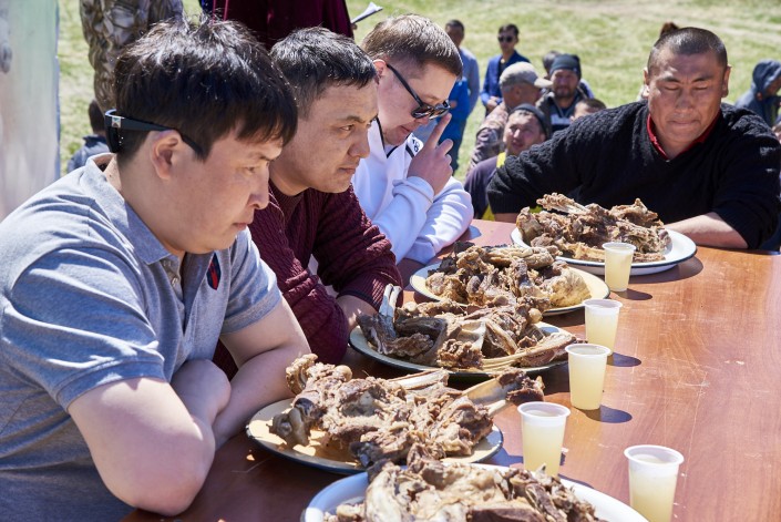 Но самым зрелищным и азартным конкурсом оказалось первенство по поеданию мяса. В состязании участвовали пять человек из разных регионов страны - Мангистау, Шымкента, Жезказгана и Улытау. Участники должны были управиться с целым подносом баранины за пять минут.