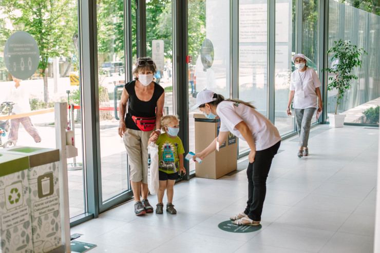 При входе измеряют температуру тела с помощью тепловизора. Также установлены санитайзеры для рук.
