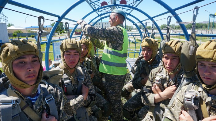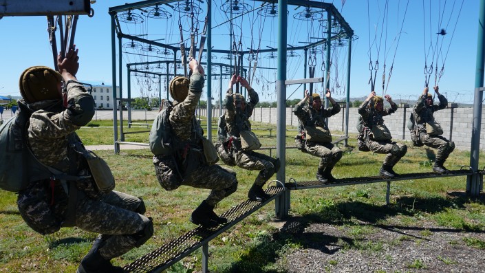 "Они должны четко знать, как разойтись друг с другом в воздухе, чтобы не врезаться друг в друга, чтобы не было столкновения между собой. Если в комплексе тренироваться, здесь ничего сложного нет", - отмечает офицер воздушно-десантной службы капитан Мади Ахметов.