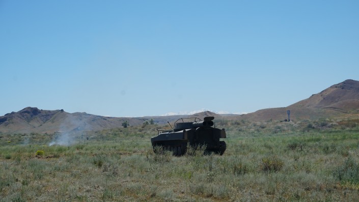 "Эта установка предназначена для прохода минных полей противника взрывным способом. Техника состоит из базовой машины и пускового оборудования. Такая же техника использовалась во время чеченской кампании. Сейчас используется в Сирии", - отметил командир дорожной роты Батыр Шоканулы.