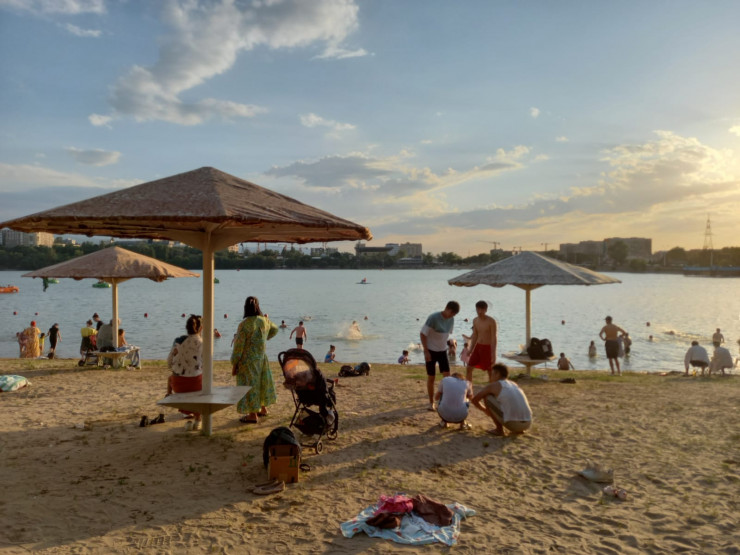 Некоторые алматинцы после работы и в выходные отдыхают на Сайране. Мы приехали туда вечером, на пляже - десятки людей.