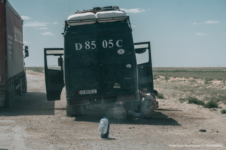 "Уже года два как начали что-то делать на этой трассе. Атырау - Астрахань - очень проблемный участок, часто аварии бывают, к тому же климат здесь жаркий, многие машины не выдерживают температуру, дороги убитые, колеса разбиваются, я вот лобовое стекло менял недельки две назад, уже все в трещинах", - рассказывает водитель из Атырауской области Женис.
