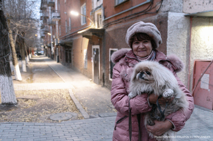 "Это Персик, а вообще его зовут Князь Серебряный от Золота Востока - такое имя у него в родословной. Это пекинес королевский, такой в Балхаше один. В парикмахерскую его водим, педикюр делаем. Моя прическа стоит 3000, его прическа стоит 10 000", - говорит Надежда Викторовна.