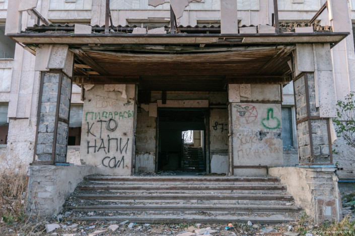 Неподалеку от школы можно заметить руины. Это и есть бывший дом культуры, о котором с таким теплом вспоминает учитель. Теперь мимо этих развалин каждый день на занятия и обратно ходят местные ученики.